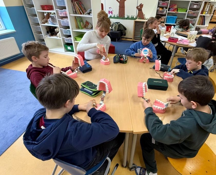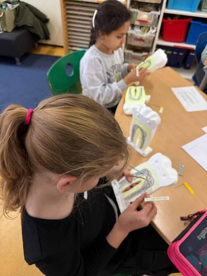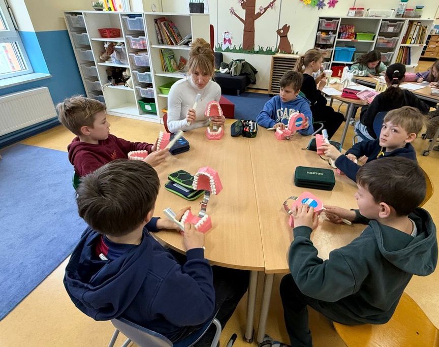In der Woche vor den Osterferien fanden wieder unsere Zahngesundheit-Projekttage mit Dr. Kaltenegger und seinem Team statt. Zum Thema Zahnhygiene und Gebissaufbau bekamen die Grundschülerinnen und Grundschüler besonderen Besuch vom örtlichen Zahnarzt. Gemeinsam lernten sie spielerisch, wie wichtig das tägliche Zähneputzen ist und welche Rolle gesunde Ernährung für starke Zähne spielt. Mit anschaulichen Modellen erklärte der Zahnarzt den Aufbau des Gebisses und zeigte, wie Karies entsteht. Besonders spannend war das praktische Üben der richtigen Putztechnik, bei dem die Kinder selbst aktiv werden konnten. Die Projekttage machten nicht nur Spaß, sondern vermittelte auch wertvolles Wissen für die eigene Zahngesundheit im Alltag.